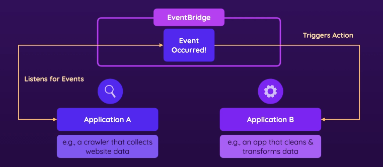 • Event bus service, it listens to events (other services can report events to EventBridge), then it can trigger actions on another service