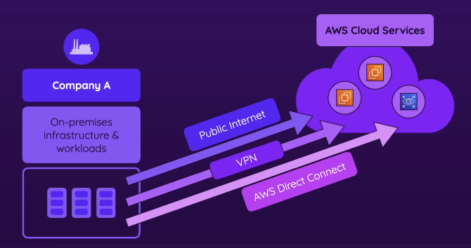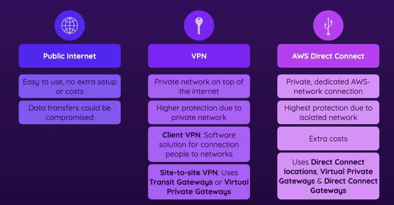- Connects individual users/devices to AWS (Used by employees, developers, or remote workers)