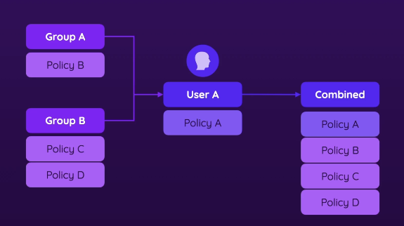 • Imagine a user has one policy, and the user is part of multiple groups