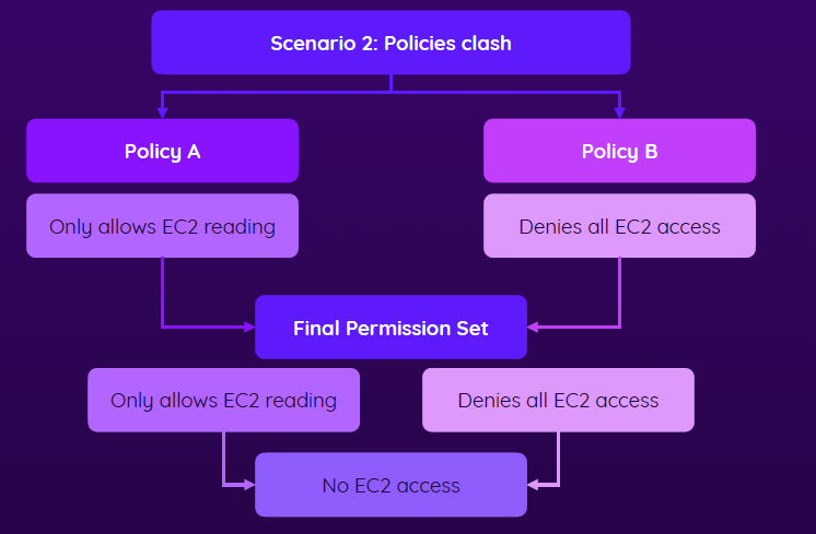 • If one policy allows reading and another disallows that, the user will not be able to access EC2 at all