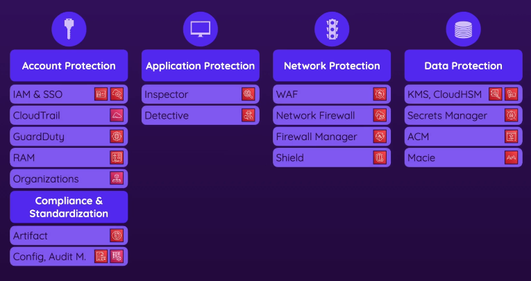 - Network Firewall - blocks threats by filtering network traffic (vpc)