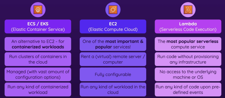 - While some compute services (like AWS ECS or EKS) run containers, compute services in general execute workloads, which can include running applications, processing data, or hosting services.