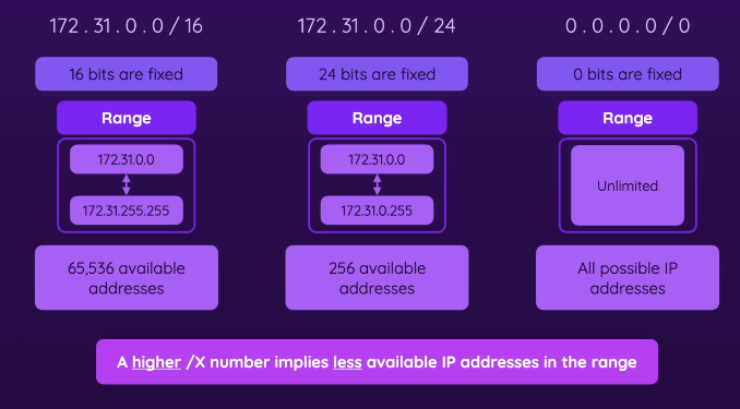 172.31.0.0/16172.31.0.0is the starting point of the range/16means that the first 16 bits of the address are fixed. This leaves 16 bits that can vary, so it gives you a range of 65,536 IP addresses (from172.31.0.0to172.31.255.255).