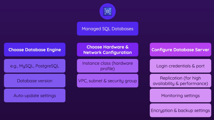 - It’s a managed SQL database service. (related: SQL (Relational) vs NoSQL (Non Relational)), so it’s less complicated than manually configuring an EC2, for example
