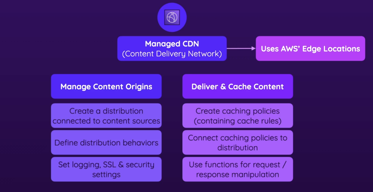 - CloudFront distributes the content → Edge locations cache and serve content based on your policies.