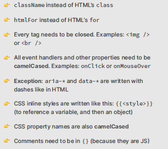 - in JSX, you cannot use “class” but you have to use “className”