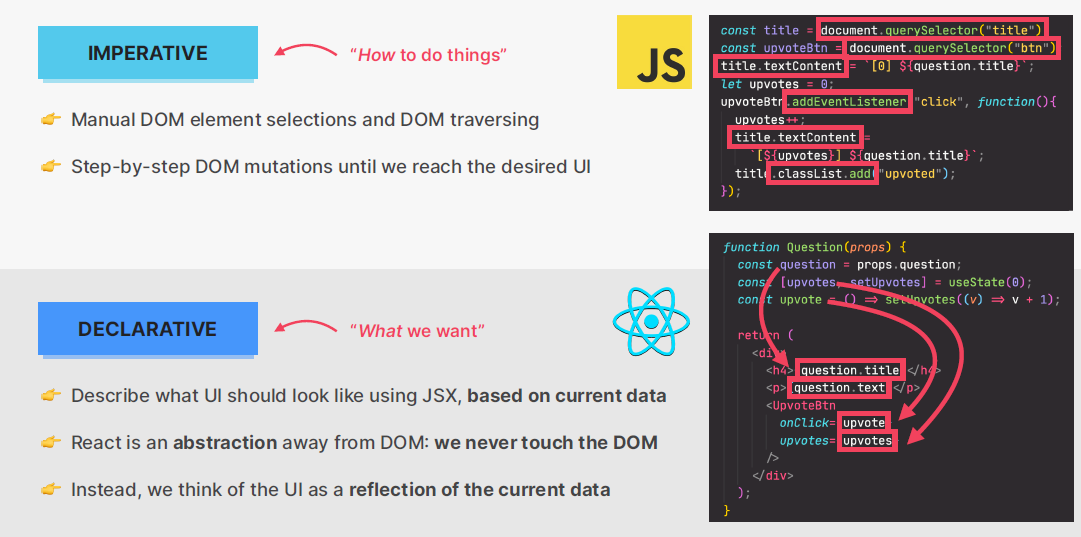 - We only tell how we want the UI to look like, and NOT how to achieve it step by step (React will figure that out)