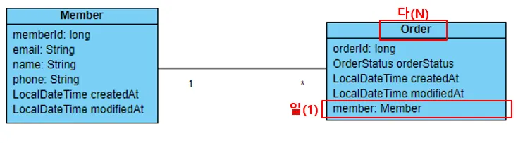 - One member can have multiple orders ⇒1:N relationship with