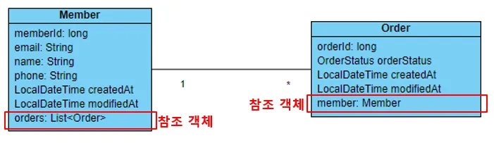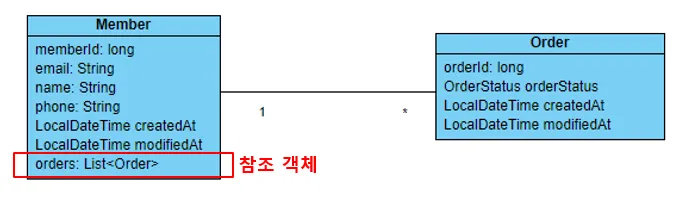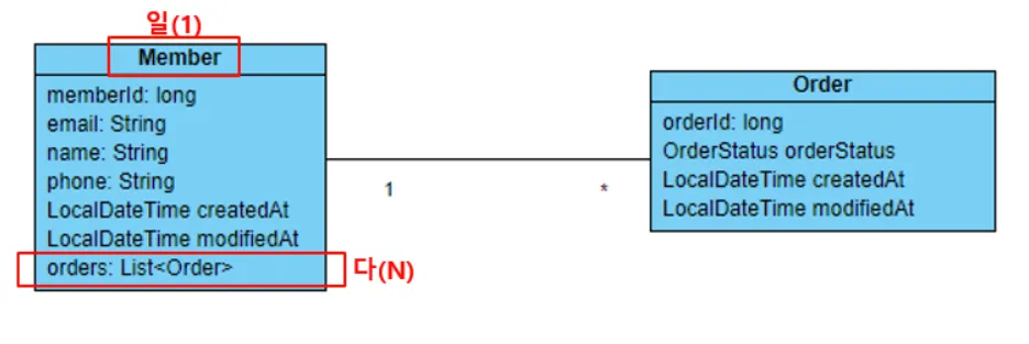Memberentity has the fieldprivate List<Order> orders;, which is marked with@OneToMany(mappedBy = "member"). - The