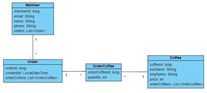 Coffeeclass has a Many-to-Many relationship with theOrderclass. AList<OrderCoffee>member variable is added here as well to create a 1:N relationship (fromCoffeetoOrderCoffee).
