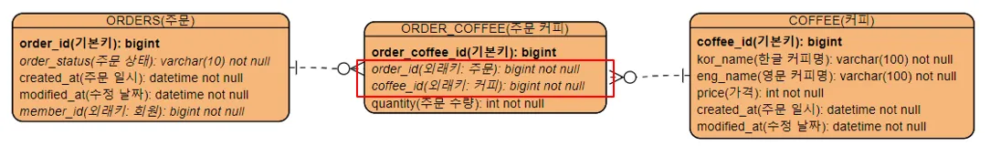 OrdersandOrder_Coffee: One-to-Many (1:N)Order_CoffeeandCoffee: Many-to-One (N:1)