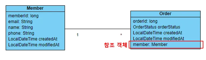 - Orderclass holds a reference to aMemberobject, so it can access theMember’s information- However, the