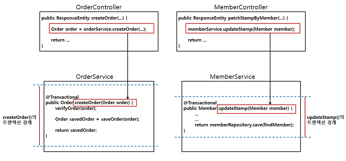 orderService.createOrder()→ saves order infomemberService.updateStamp()→ update stamp- If these two transactions are executed independently like this
