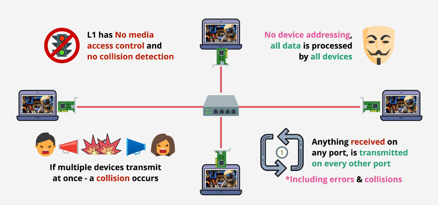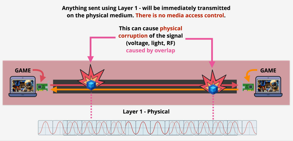 • collisions are guaranteed, and it cannot even detect when collisions occur, as this layer just transmits voltage via shared medium