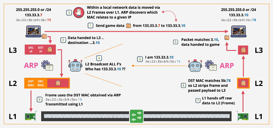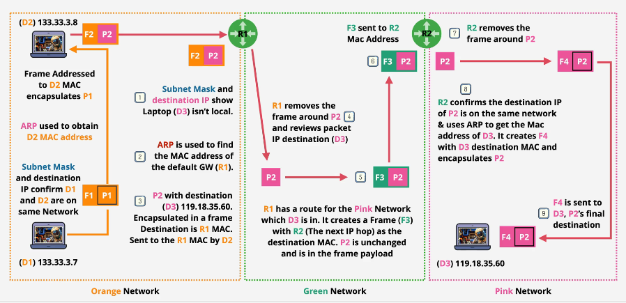 - Layer 2 Frame: Wraps the IP packet and includes the source & destination MAC addresses