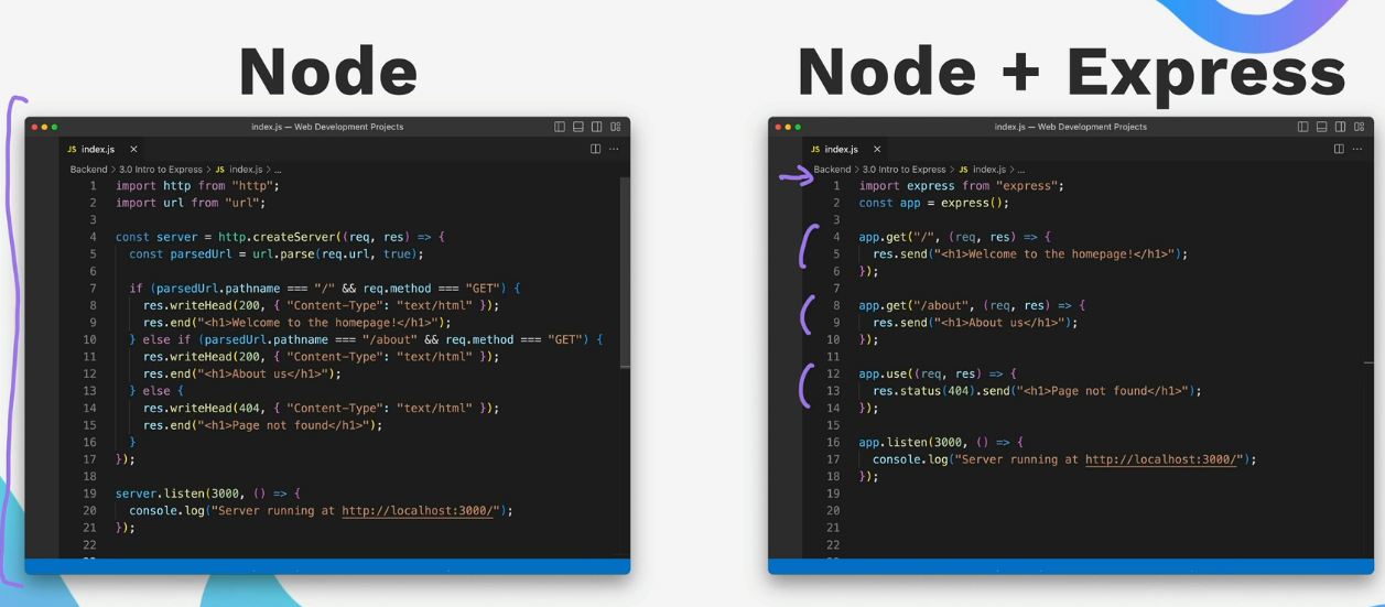 • its like using a manual screwdriver (node.js), then using an electric screwdriver (express.js)
