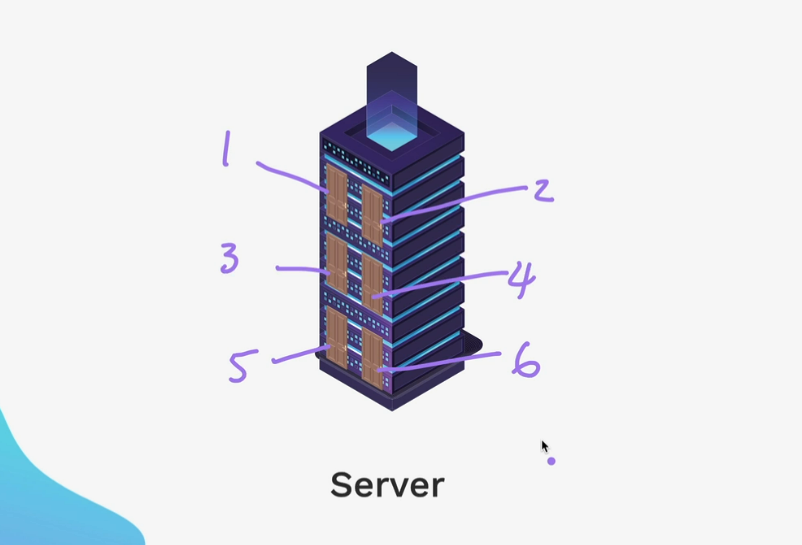 • Your application (Express.js) binds to port 3000 — like the person standing behind the door, ready to answer knocks.