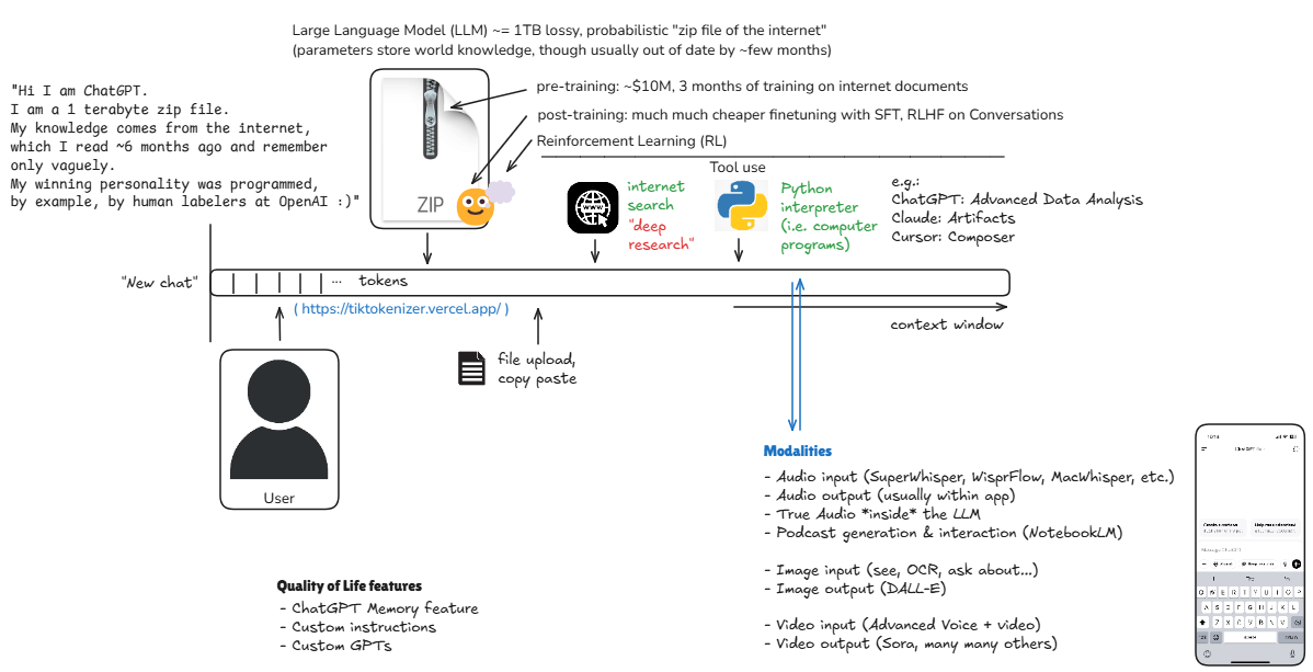 • The entity is fully self contained entity by default. Think of it as a 1TB file on a disk, secretly representing 1 trillion parameters, trying to give you next token in a sequence. No calculator, python, internet, www, nothing, no tool. You’re talking to a zip file (which has knowledge from pre-training and style/form from post training) where if you give tokens, it will string tokens back.