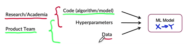 - In lot of research teams, data is usually fixed and vary the code + hyperparams. But in lots of product teams, the usually let the code fixed and vary the data + hyperparams