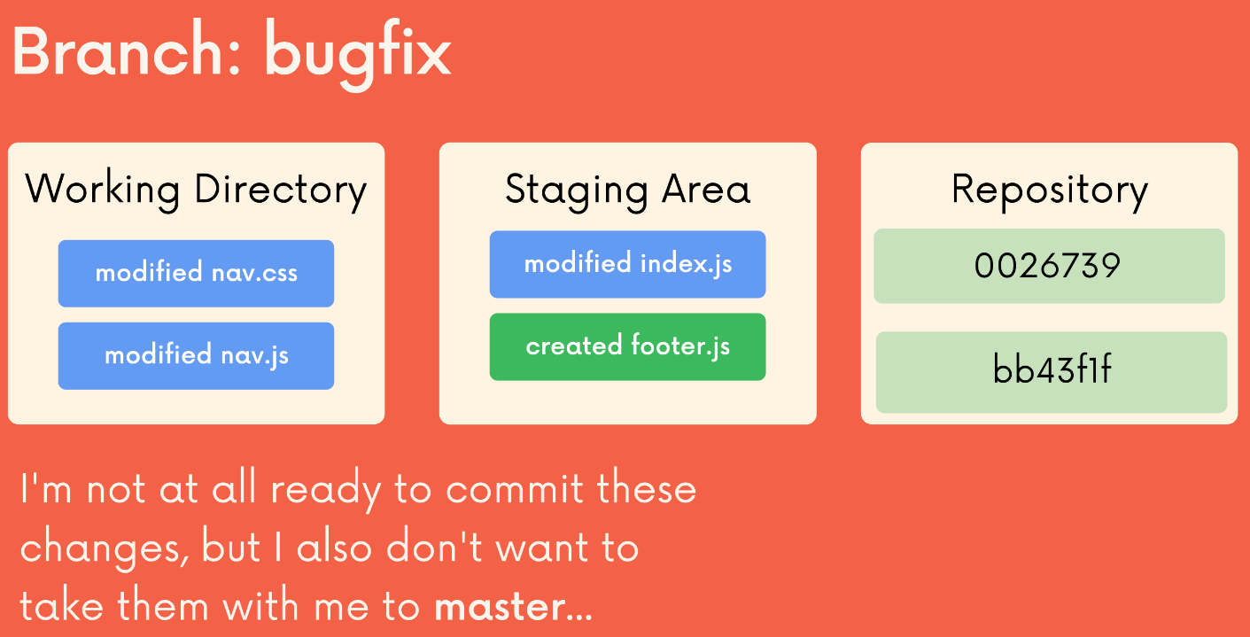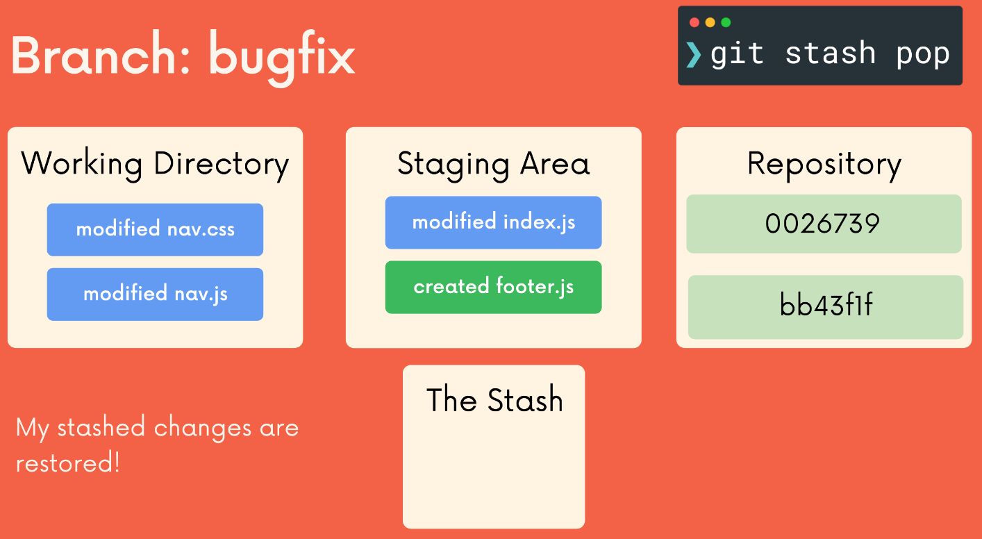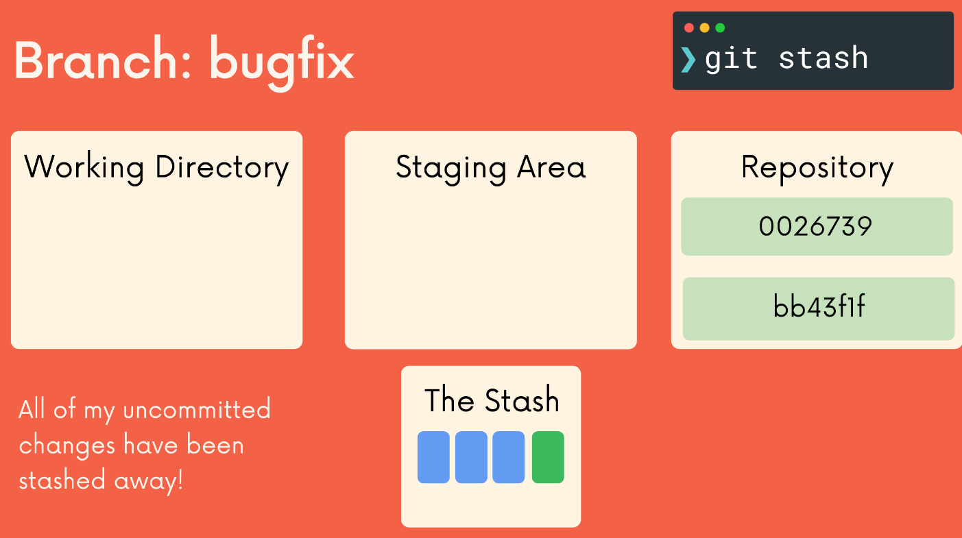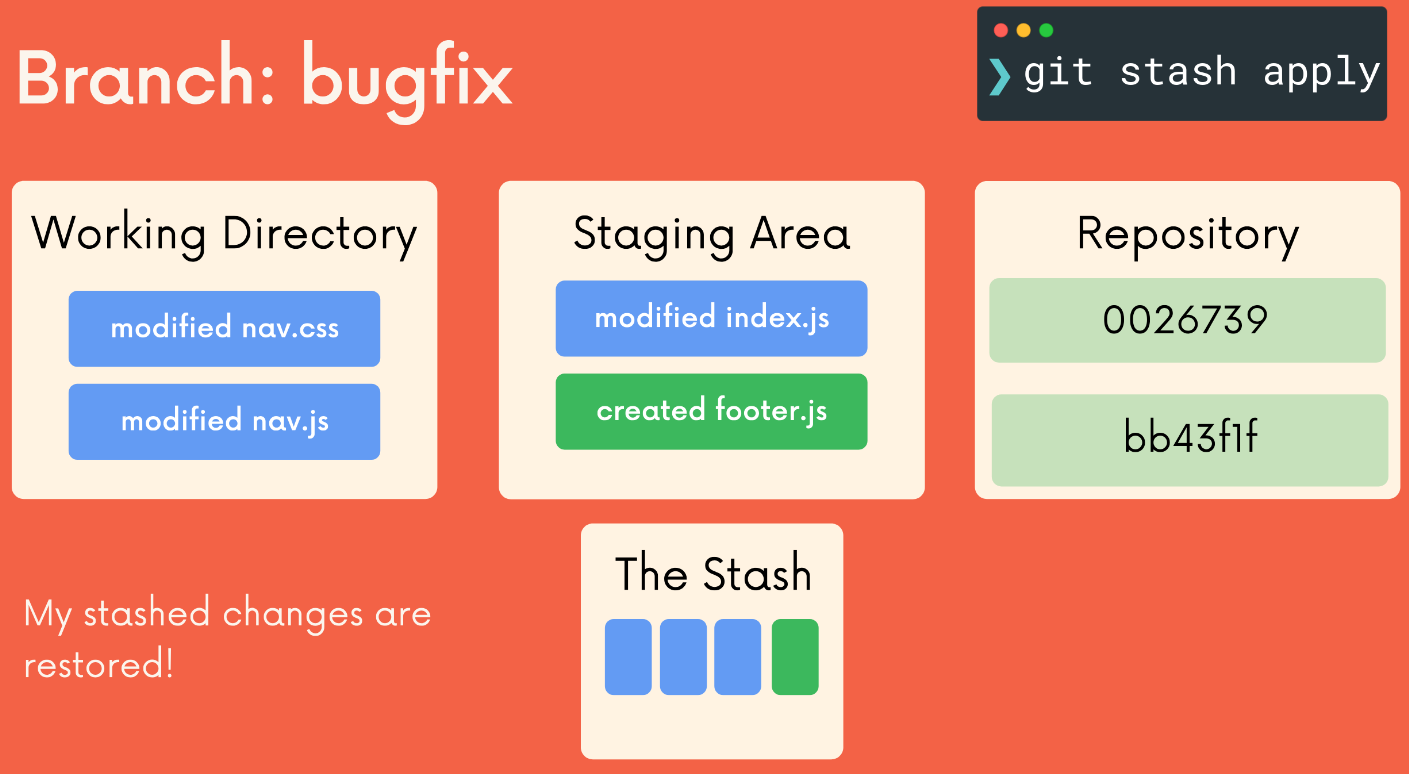 - You can then apply these stashed changes back to your working directory whenever you’re ready
