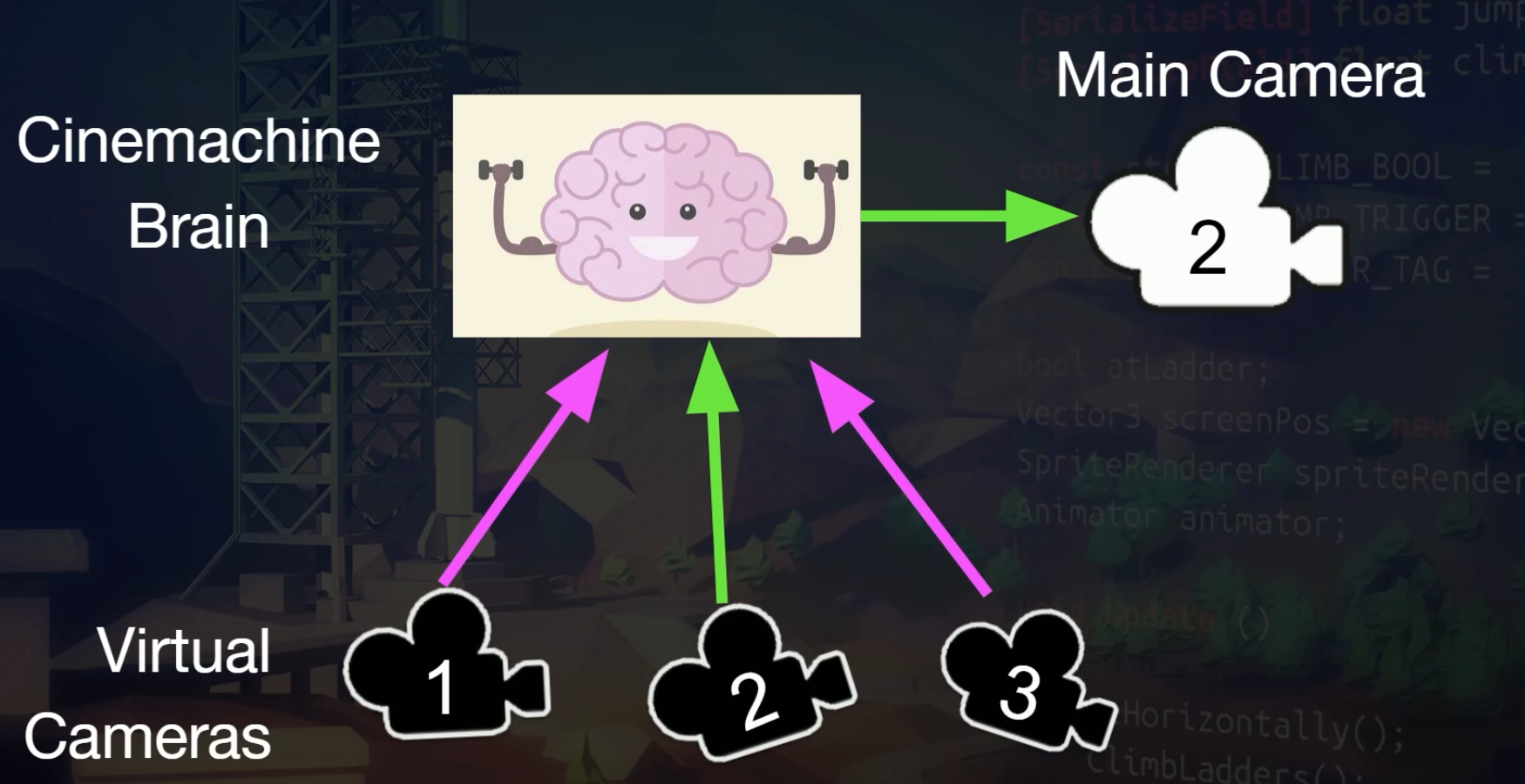 Cinemachine does not create new cameras. Instead, it directs a single Unity camera for multiple shots. You compose these shots with Virtual Cameras. Virtual Cameras move and rotate the Unity camera and control its settings.