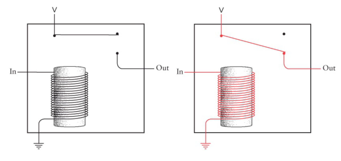 - A weak incoming current (from the first long wire) arrives at the relay.