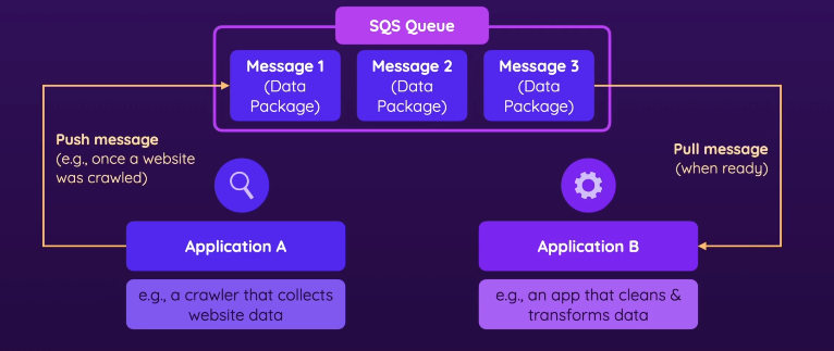 • A queuing service where you push messages onto a queue from App A, and other applications like App B can read messages from that queue whenever it has time